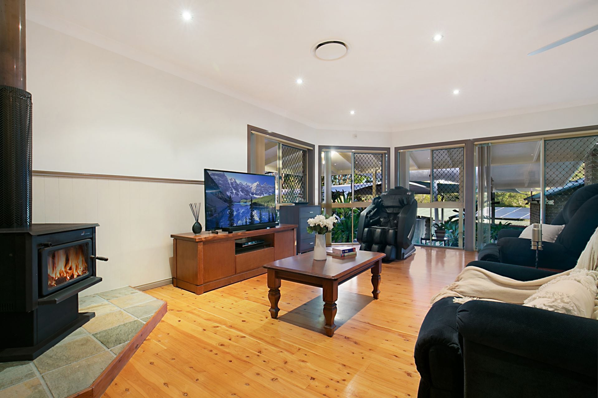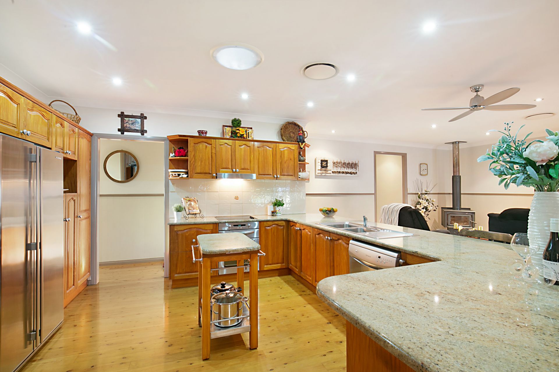 Stepping through further into the home, you will find an expansive open-plan living and dining zone. A combustion fireplace will heat things up this coming Winter, adding further to the naturally cosy ambiance of the home. At the heart of the casual zones is a solid timber gourmet kitchen. New Guinea Rosewood cabinetry is complemented beautifully by granite benchtops in the kitchen where you will find a full range of quality stainless steel appliances.