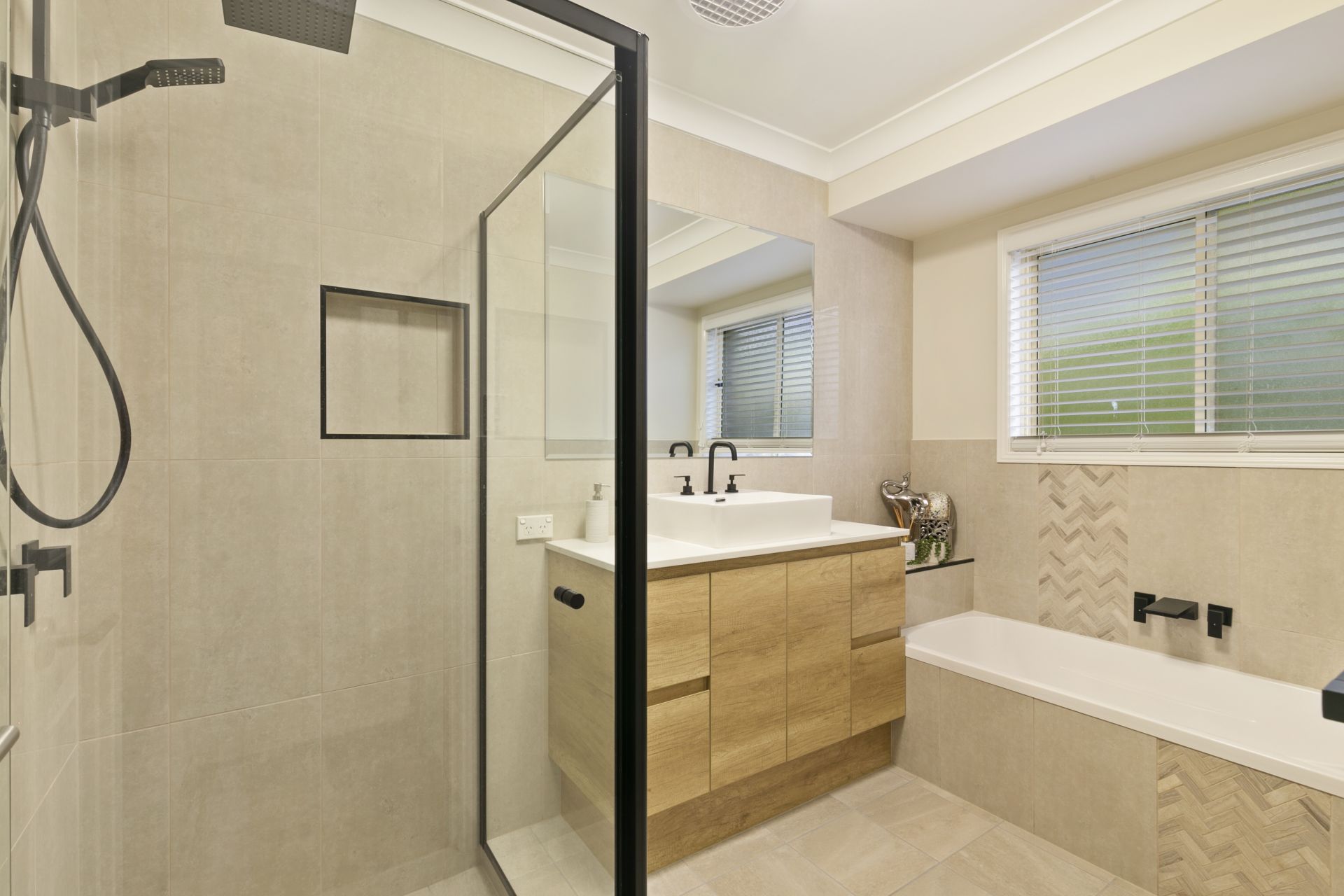 A second newly renovated main bathroom services the remainder of the home beautifully. This stylish bathroom also features floor to ceiling tiles, chic timber cabinetry, black hardware, and white stone benchtops.
