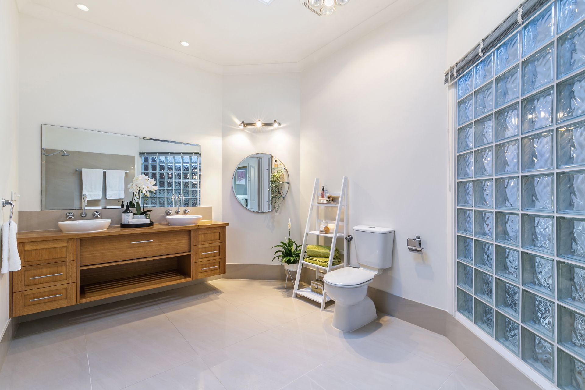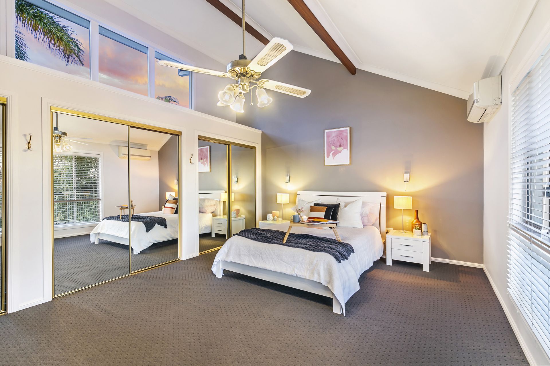 There are a total of four bedrooms, two ensuited king sized bedrooms and two queen sized bedrooms, another of which enjoys a two-way bathroom/ensuite. The master suite sprawls over the upper level of the home, where soaring ceilings and vast windows showcase the incredible view. A luxurious open ensuite features a solid timber vanity with double basins to cut down on bathroom time for busy couples. A full wall of his & her built-in robes offer an enormous amount of robe space, and a private deck is the perfect spot to enjoy the outlook in peace.