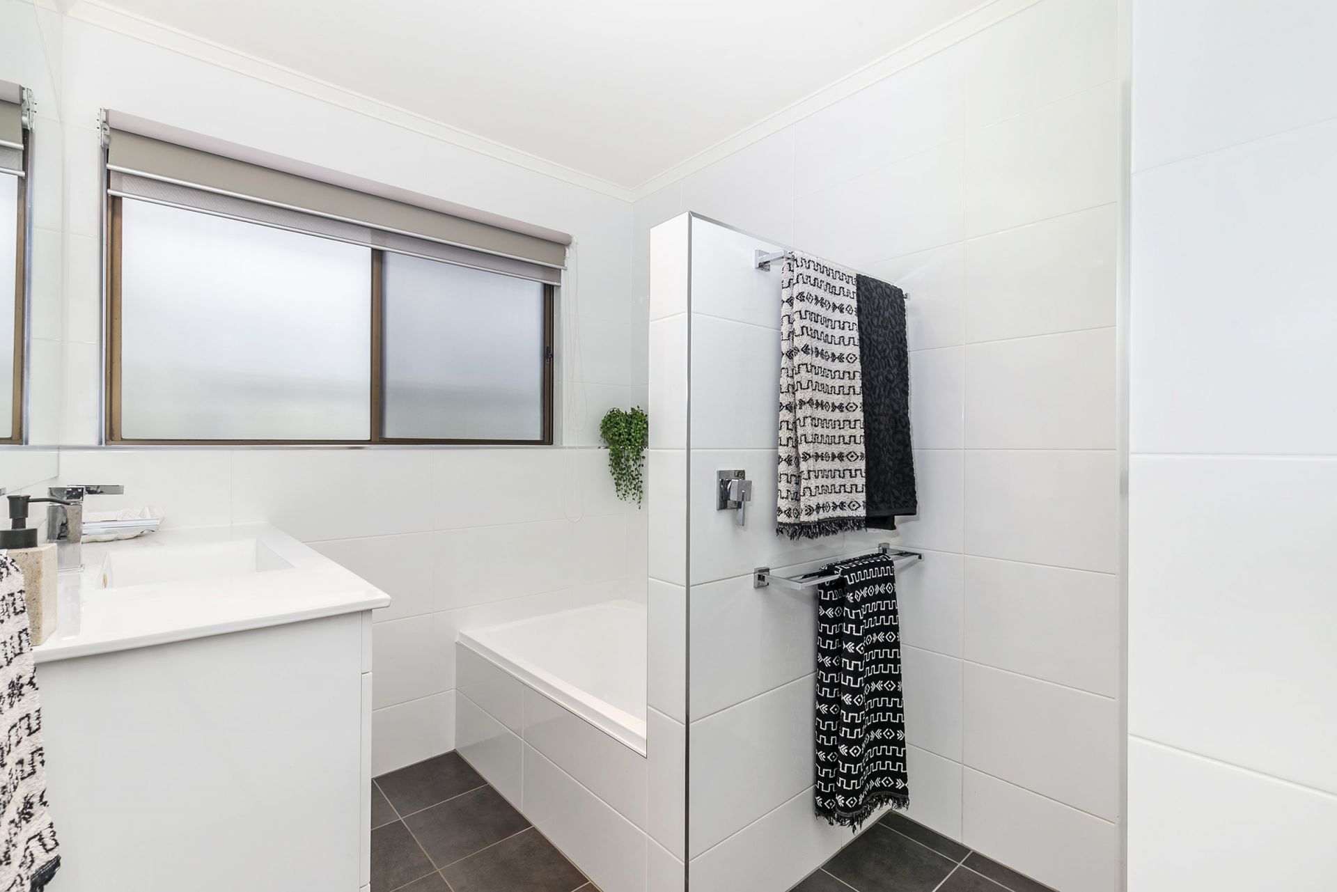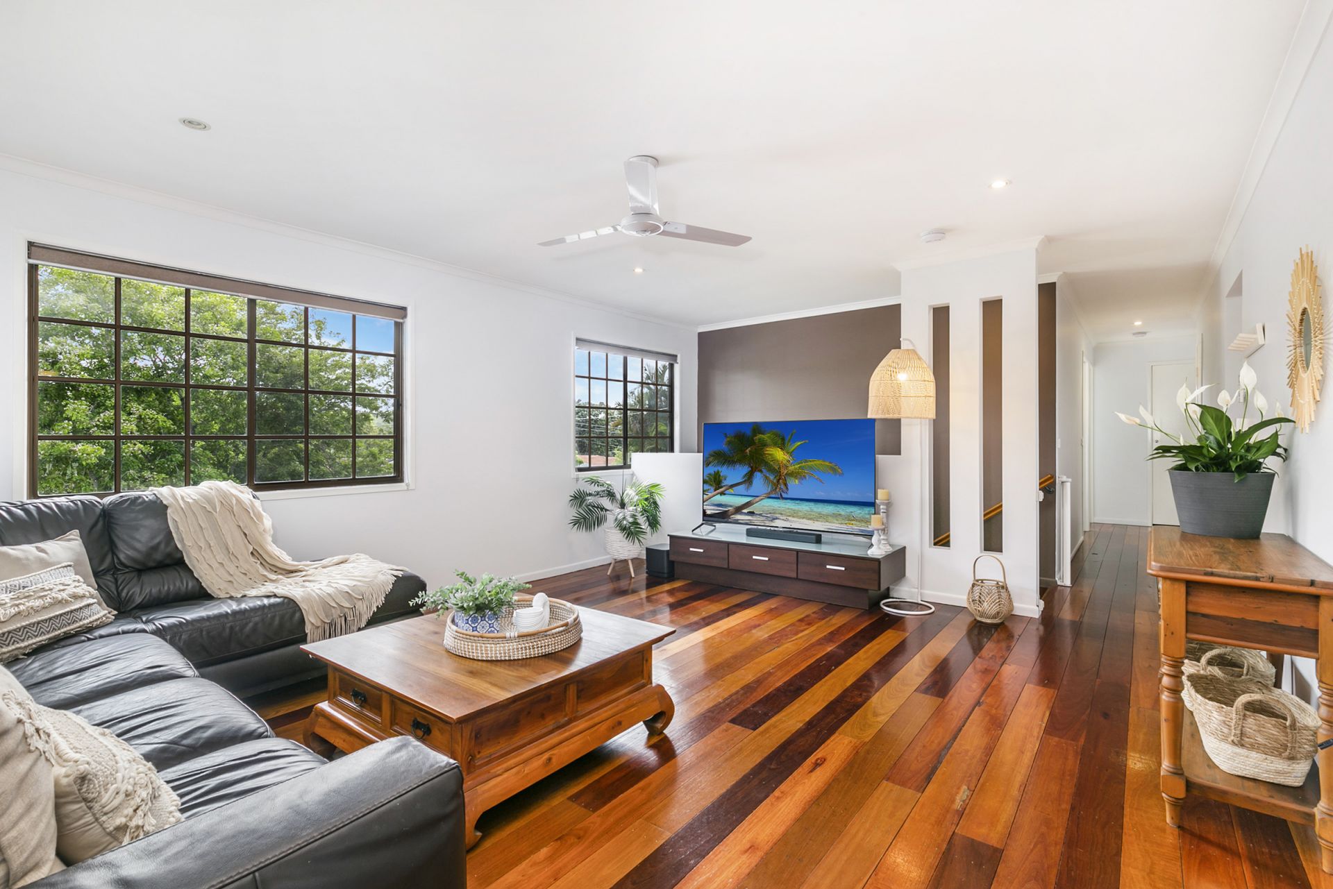 On the upper level you will discover three bedrooms all with built-ins, ceiling fans & air-conditioning. There is a modern white bathroom with soaker tub, floor to ceiling tiles and a separate toilet for convenience.