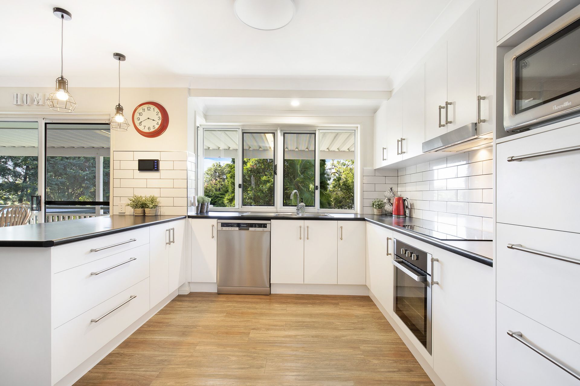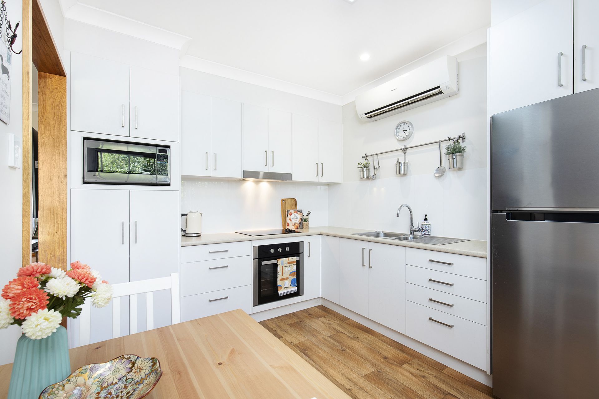 • A modern, white kitchen (four years old) with black benchtops. The kitchen is superbly appointed with with a full range of stainless-steel appliances including a dishwasher and offers an abundance of cupboard and bench space.