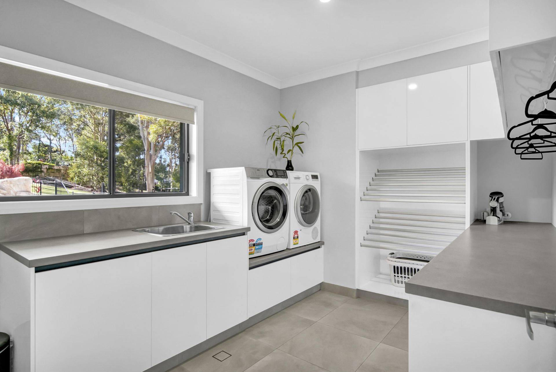 • Very well-designed Internal laundry with plenty of cupboard and bench space, a clever drying rack and additional clothing rails