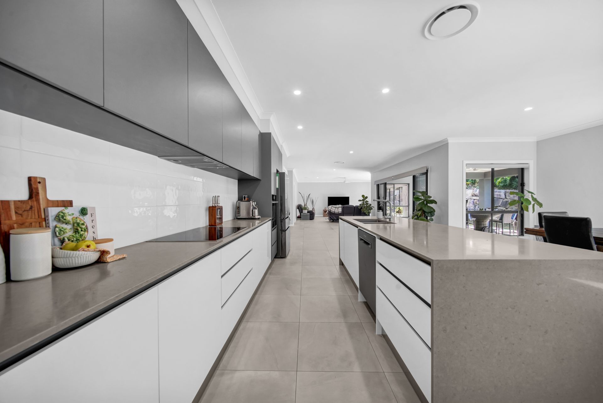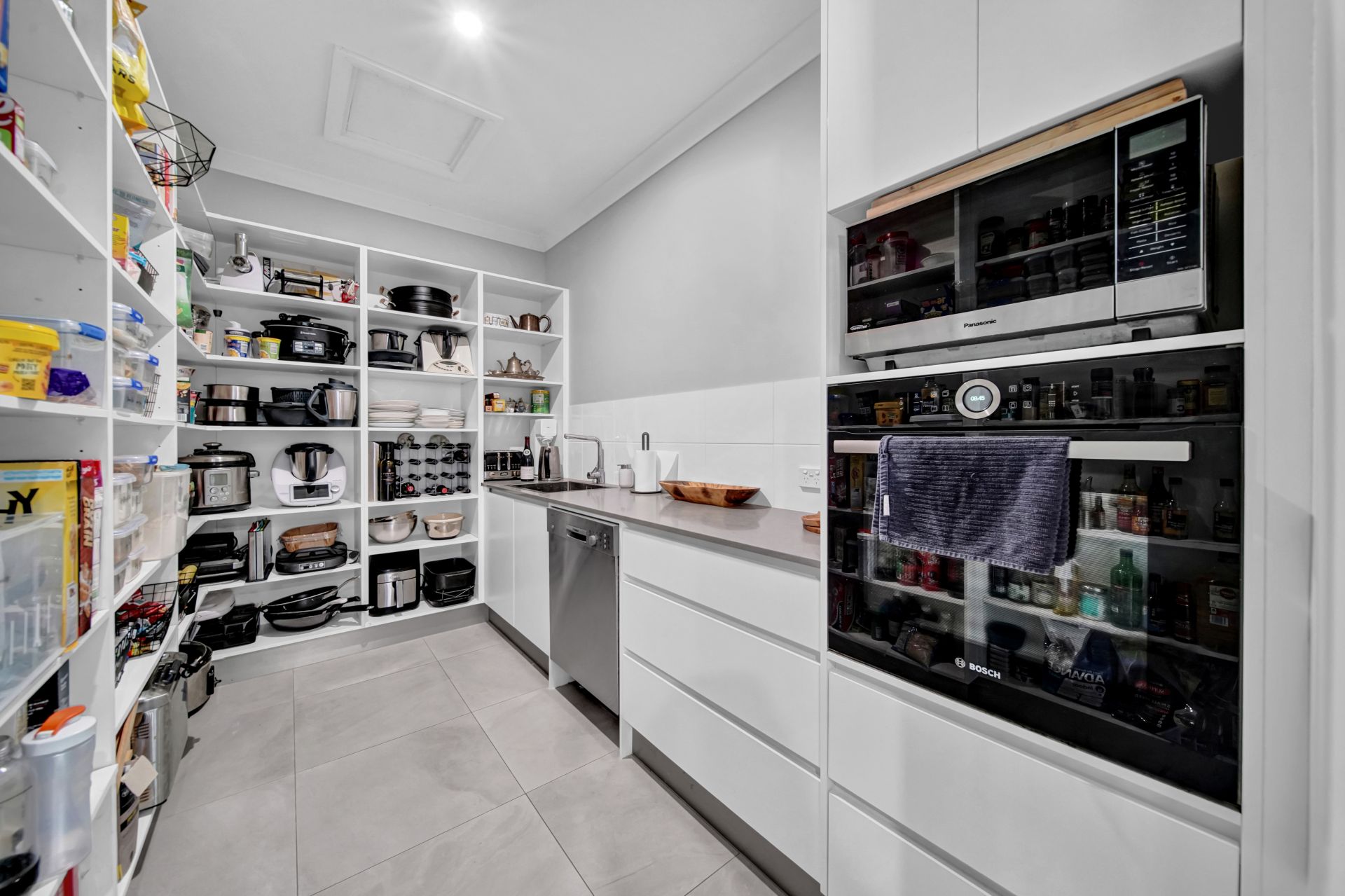 One of the stars of the home is the sleek and sophisticated designer kitchen, with its striking mix of white and dark toned cabinetry and earthy stone benchtops. Superbly appointed, the kitchen offers an abundance of space and a full range of quality stainless steel appliances including a 900mm Bosch induction cooktop, Bosch oven and dishwasher. The butler's pantry is next level and features a second Bosch dishwasher and oven, along with a second sink, an abundance of preparation bench space and well-designed shelving.