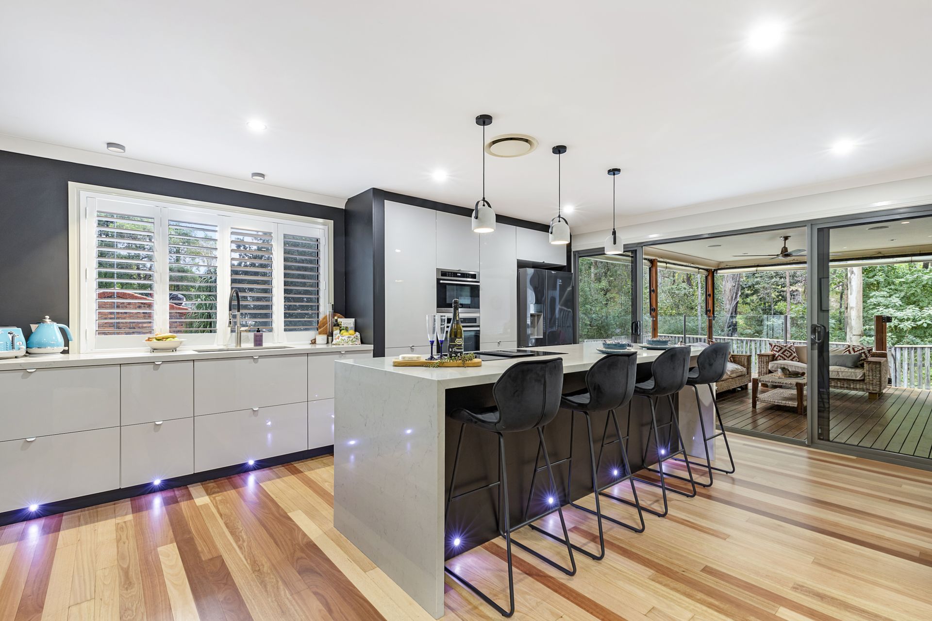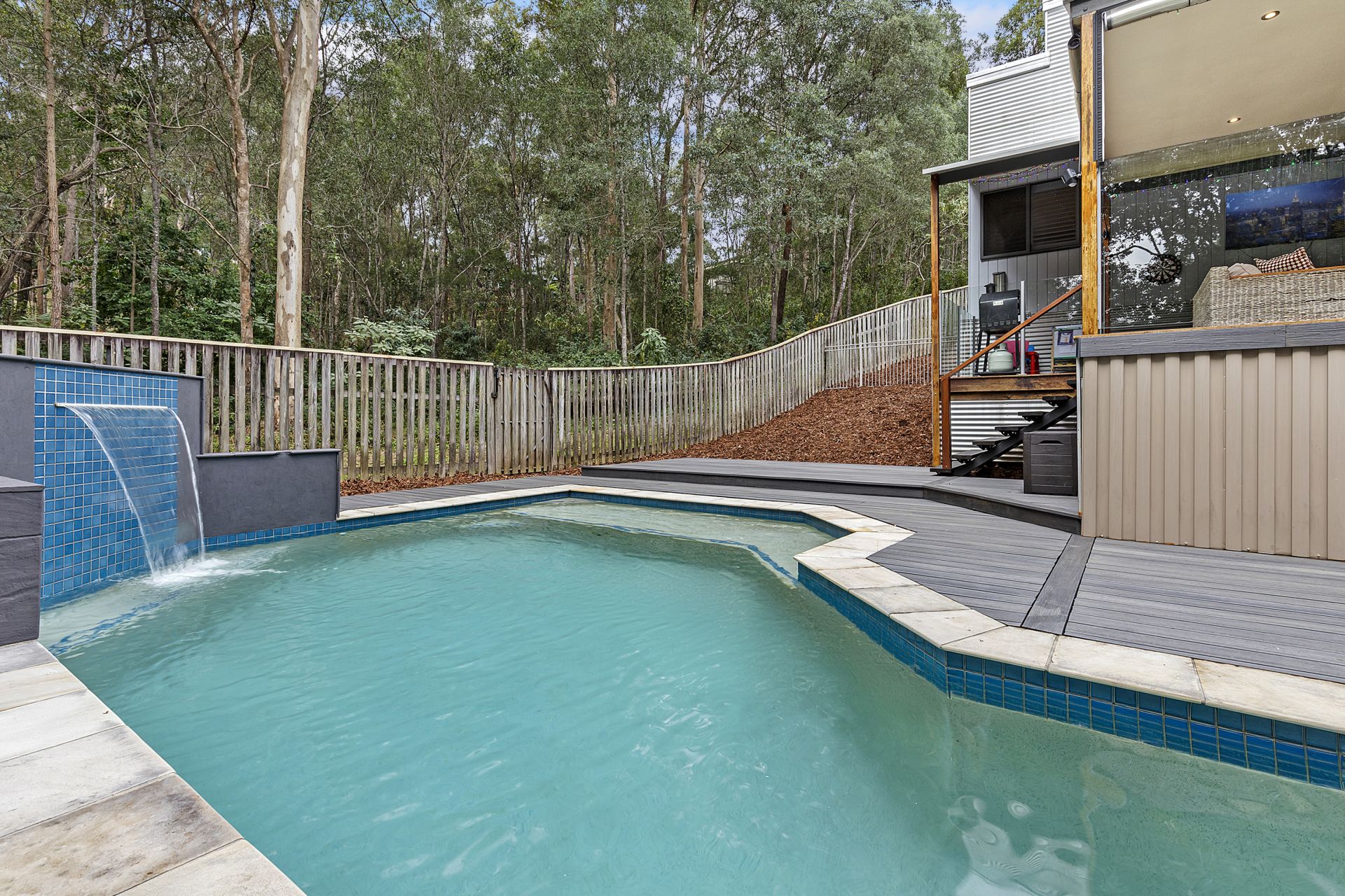 From your entertaining area, enjoy watching the kids splash in the striking inground saltwater pool, with its stylish waterfall feature and new composite decking designed for easy care maintenance and to last.