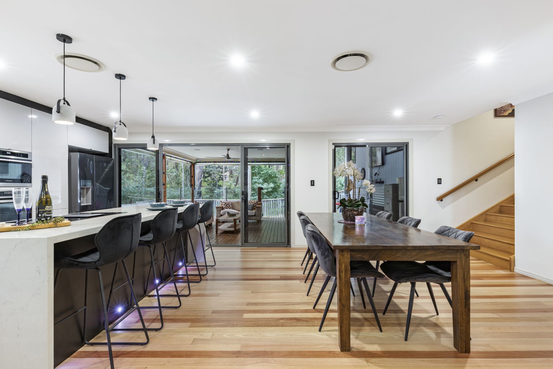 Flowing seamlessly from the casual living and meal zones is the expansive covered entertaining deck. Entertain the largest of crowds in style and soak in your serene bushland surrounds. You may even spot the resident koalas, and visits from wallabies and native birdlife. Pull down Café blinds make the entertaining area even more enjoyable.