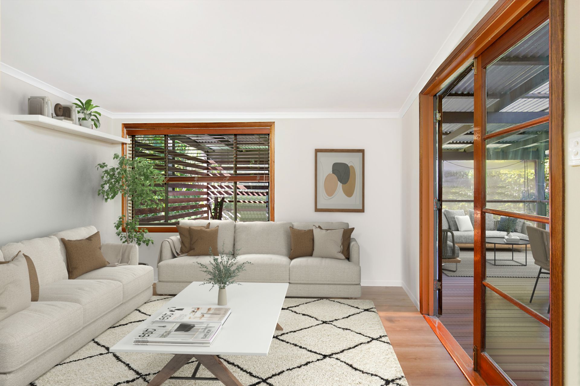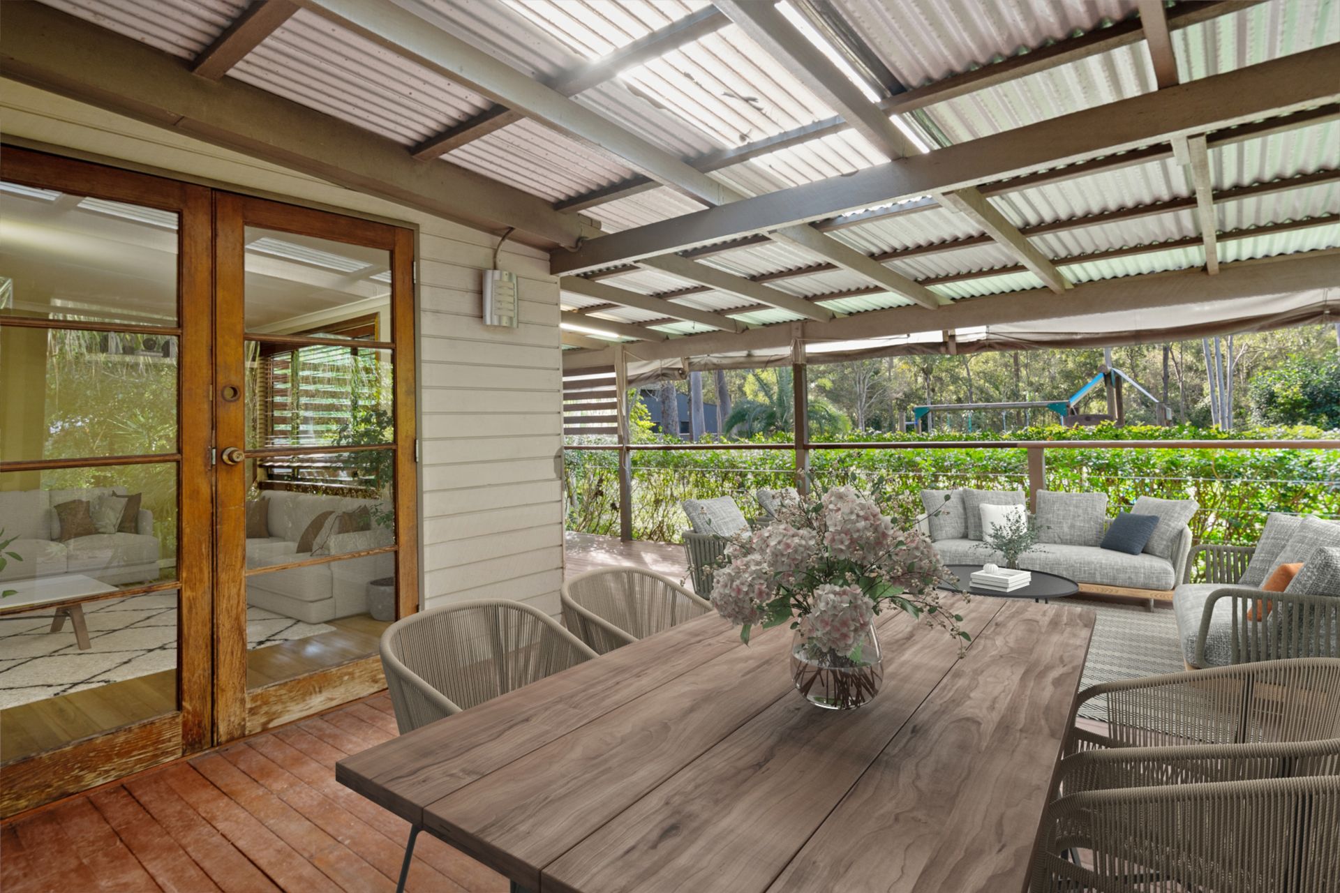 • Separate multi-purpose room (ideal home office with separate entry) with double door access to back deck and single door access to front verandah. Timber shutter-doors separate both living areas