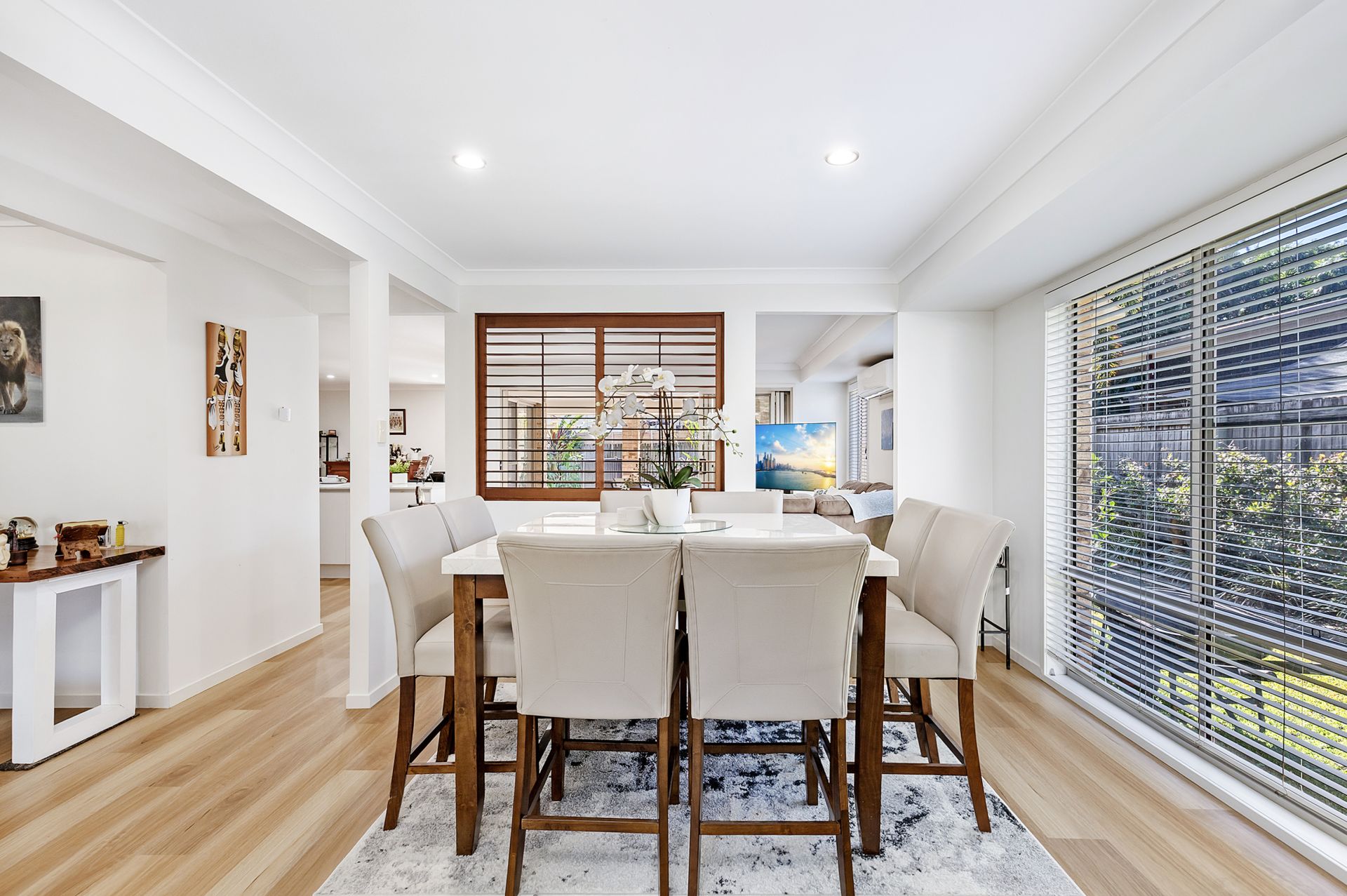 Open and airy, a step inside reveals a functional, well-devised floorplan where open-plan living reigns supreme. Two separate and spacious living and dining zones unfold over the one light-filled level. Timber shutters and a leafy and private outlook through to the rear yard add a resort-style feel to the home. Modern, light-toned hybrid floorboards are a new addition that add to the appeal & functionality.