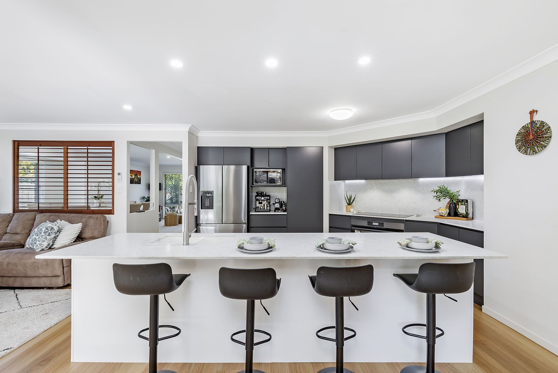 One of the stars of the home is the NEW designer kitchen. Designed for the entertainer, the vast island bench allows you to stay engaged in cooking and socialising with ease. Dark cabinets are contrasted smartly with marble look stone benchtops and matching splashbacks. Superbly appointed, the kitchen features a full range of quality appliances including a stainless-steel dishwasher, a sleek 900mm electric oven and induction cooktop, along with an enormous walk-in pantry.