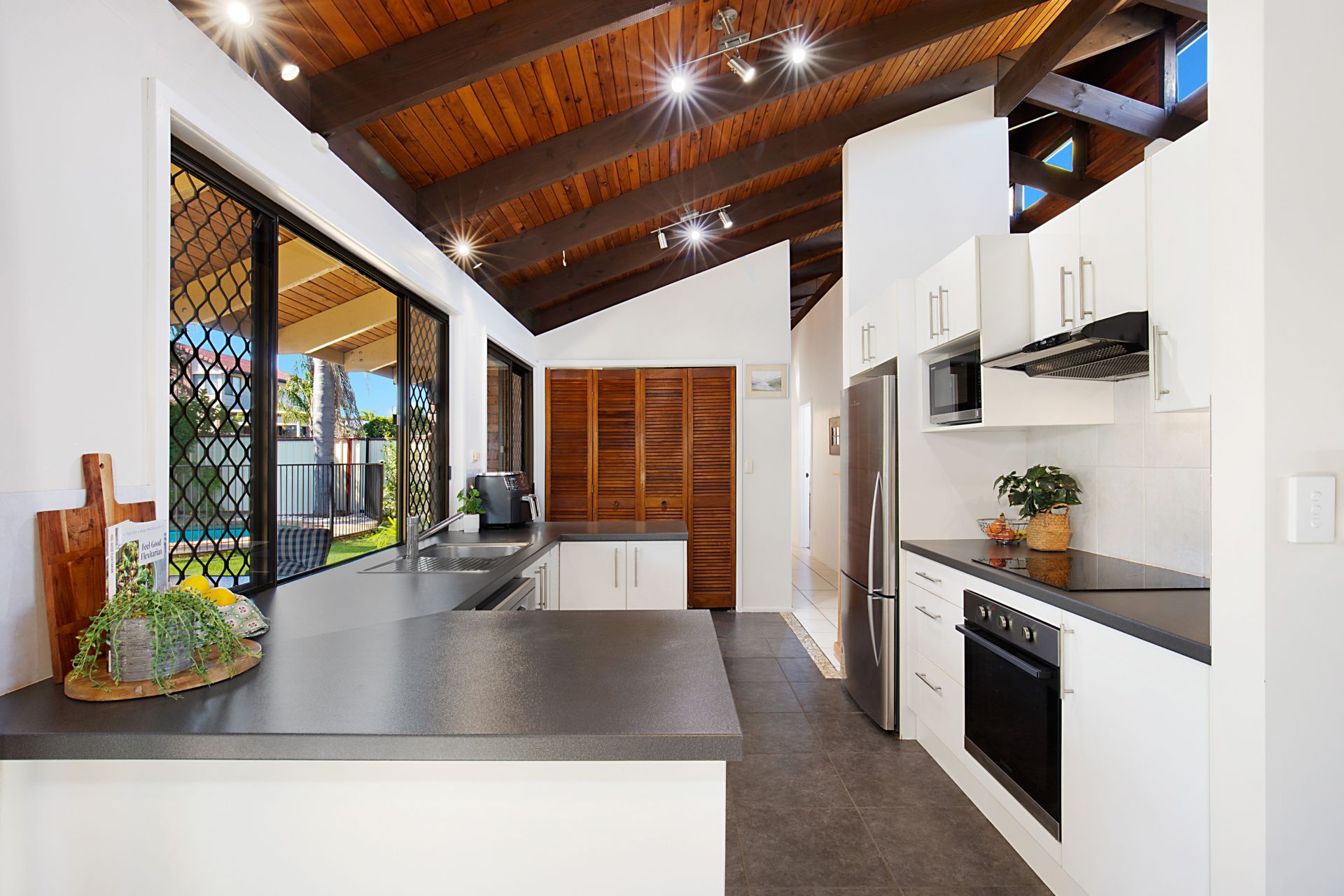 • A pitched roof covered outdoor entertaining area enjoys direct views over the pool and backyard.