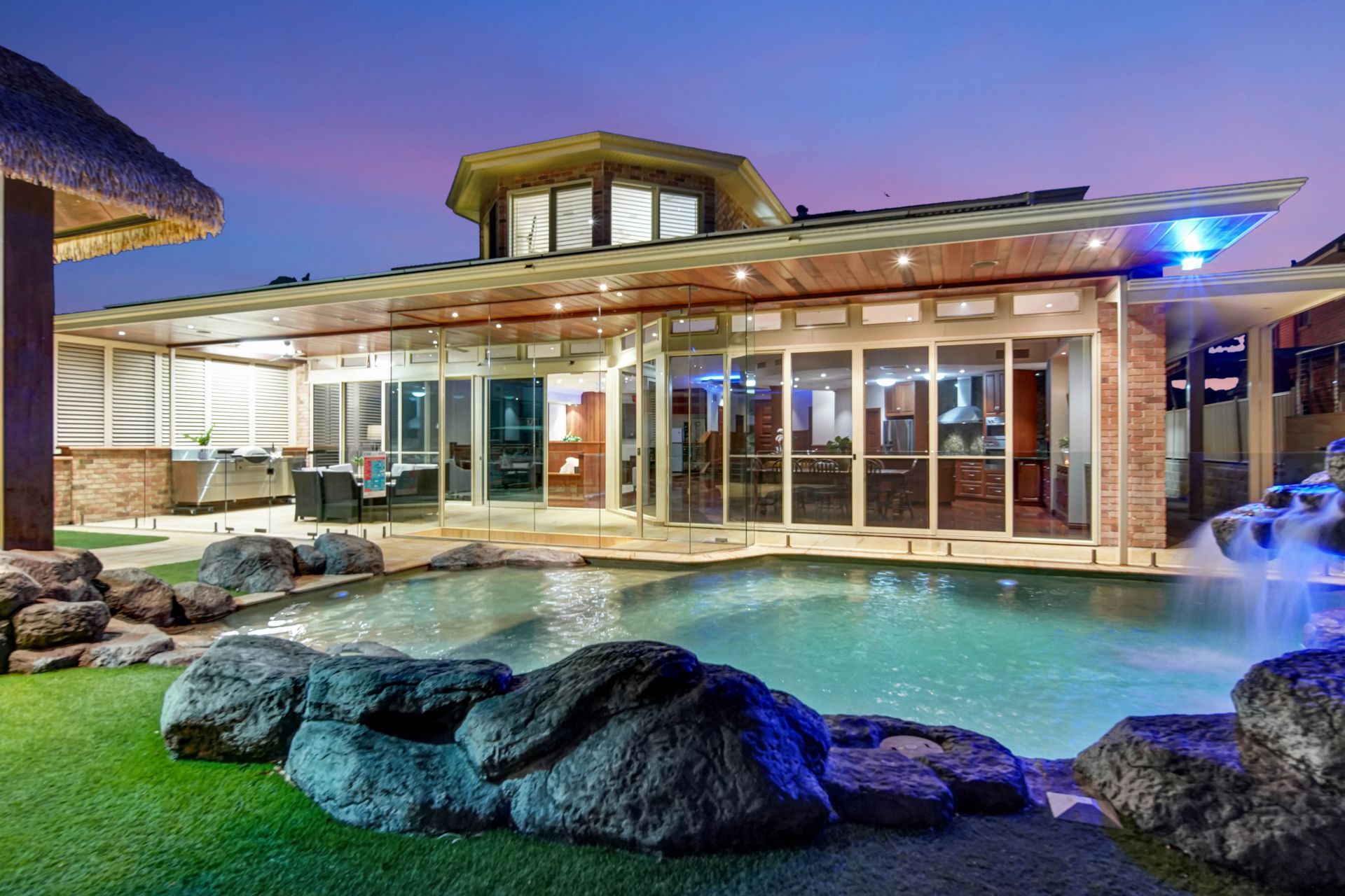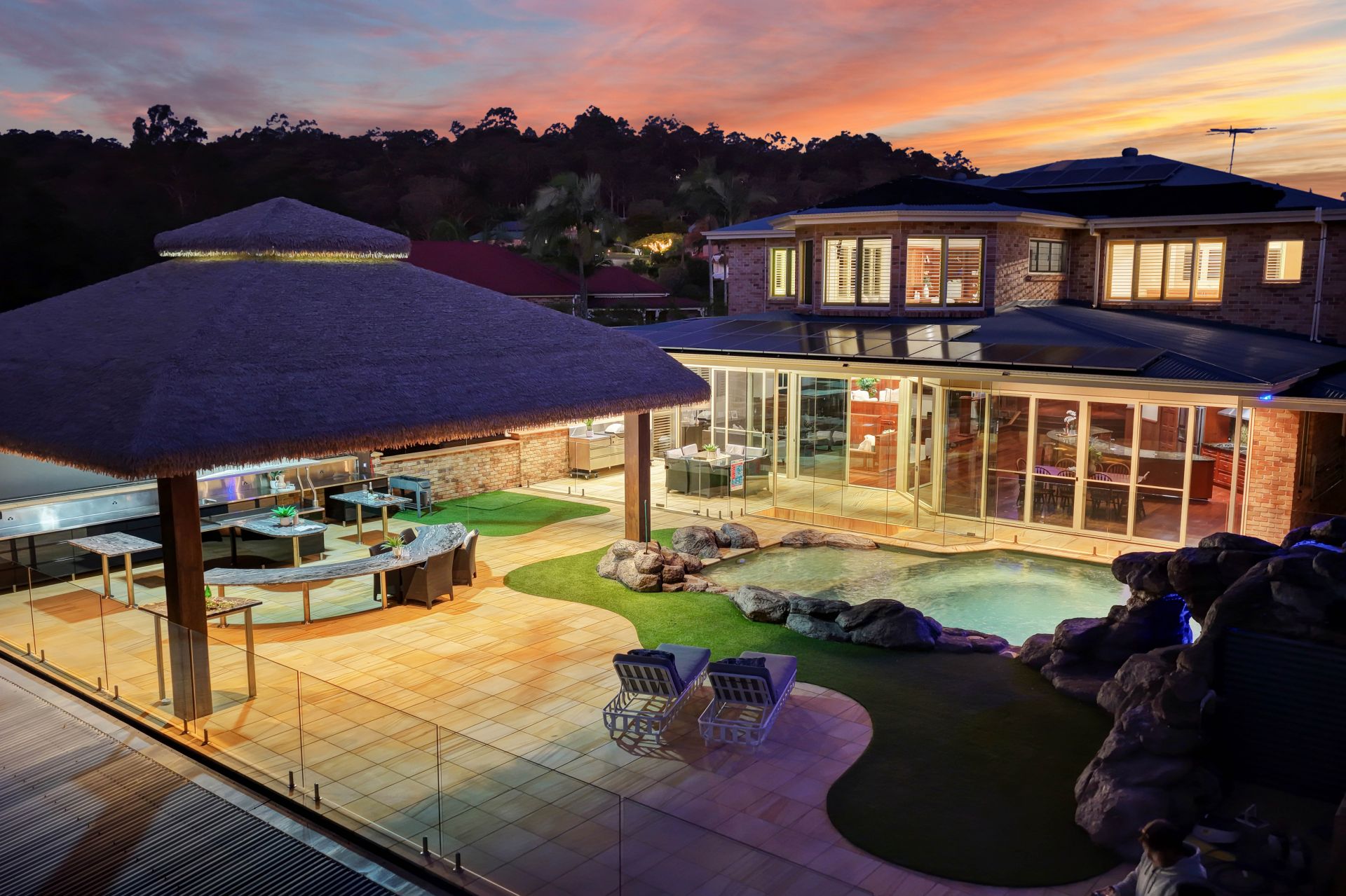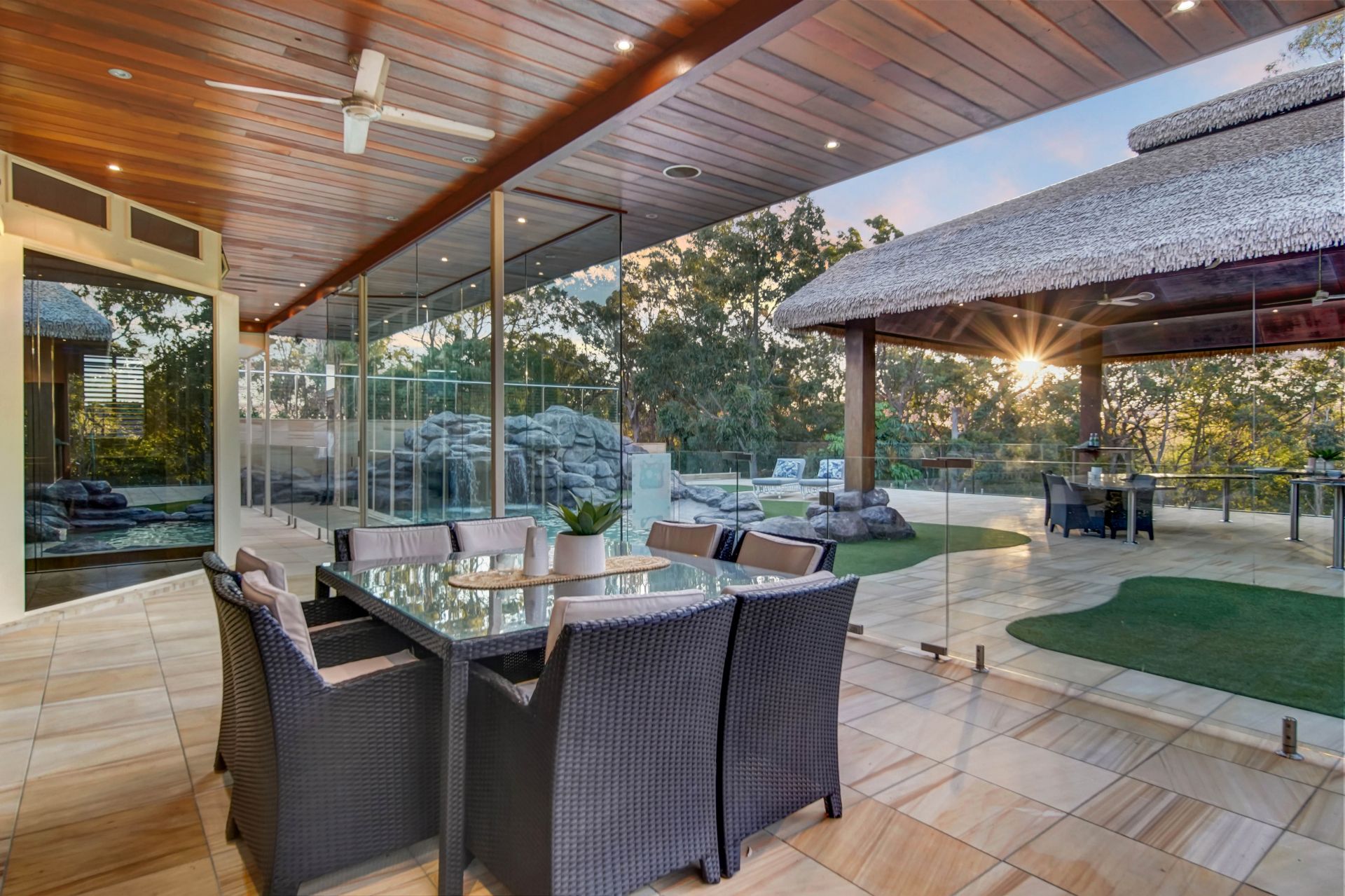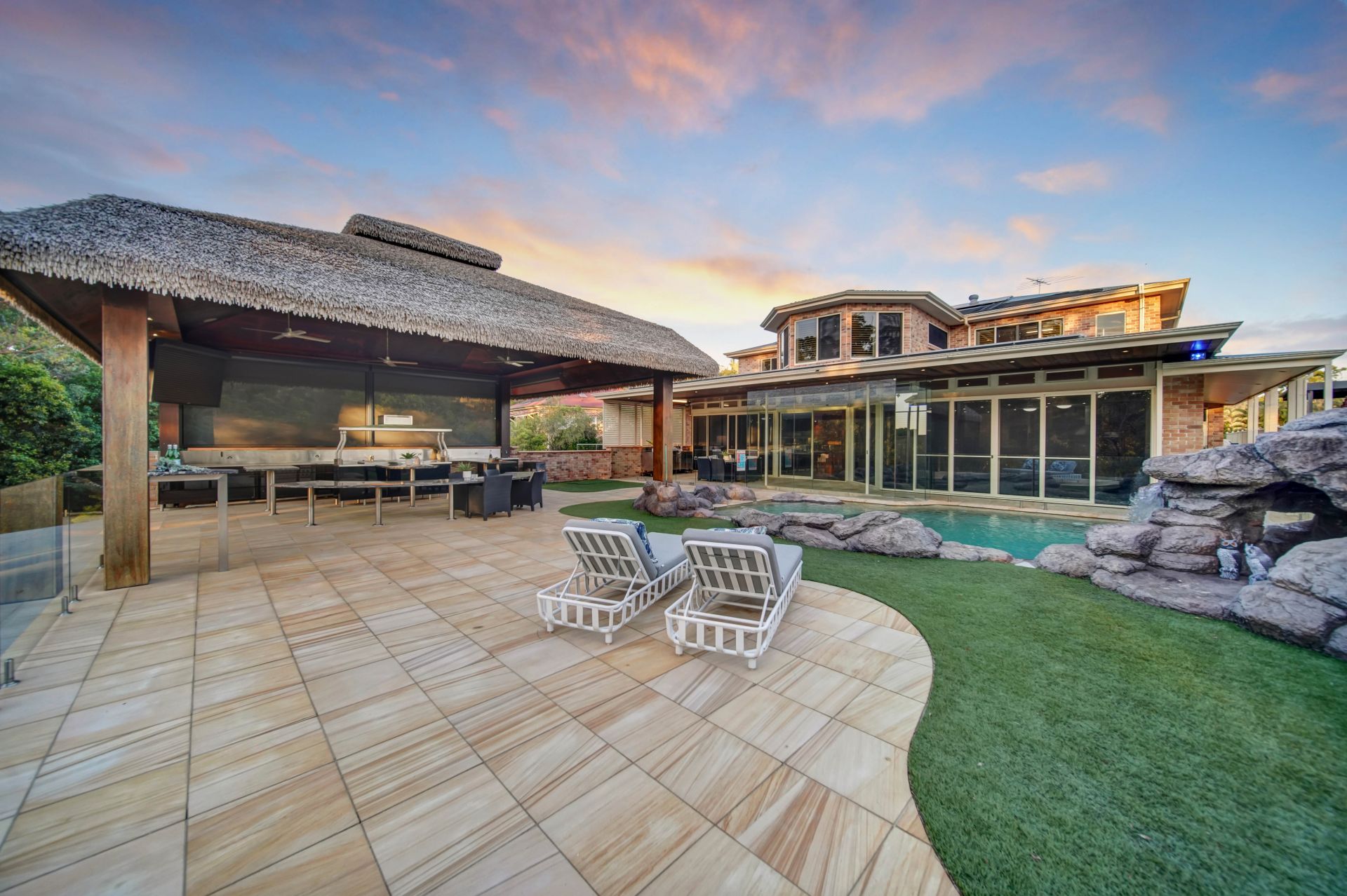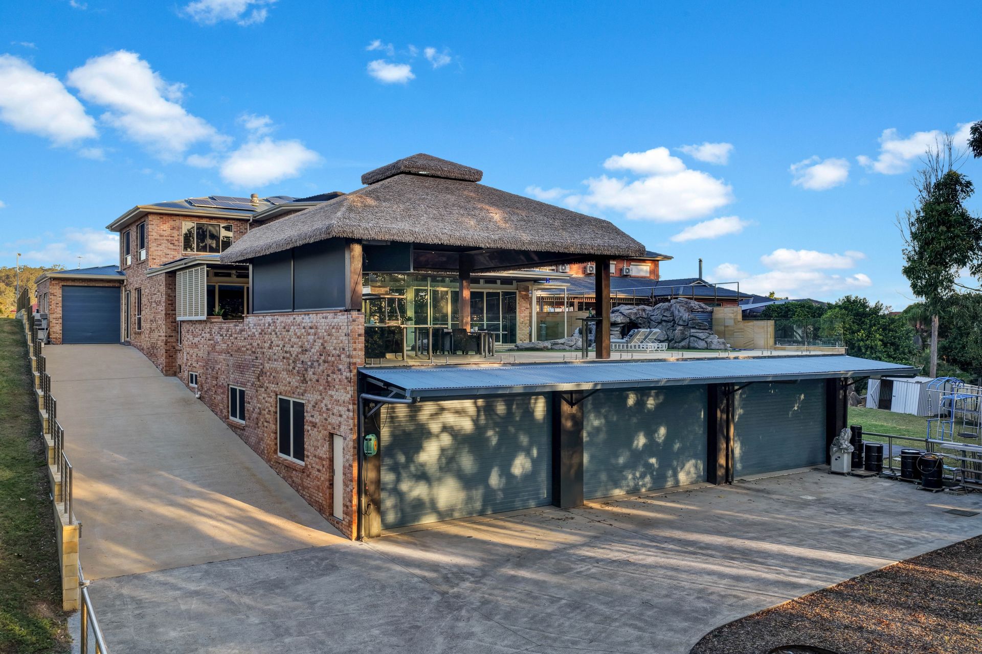• Covered entertaining area plus an enormous, thatched roof Bali hut with built-in marble benches, stainless steel benchtops for food prep and a built-in BBQ zone.