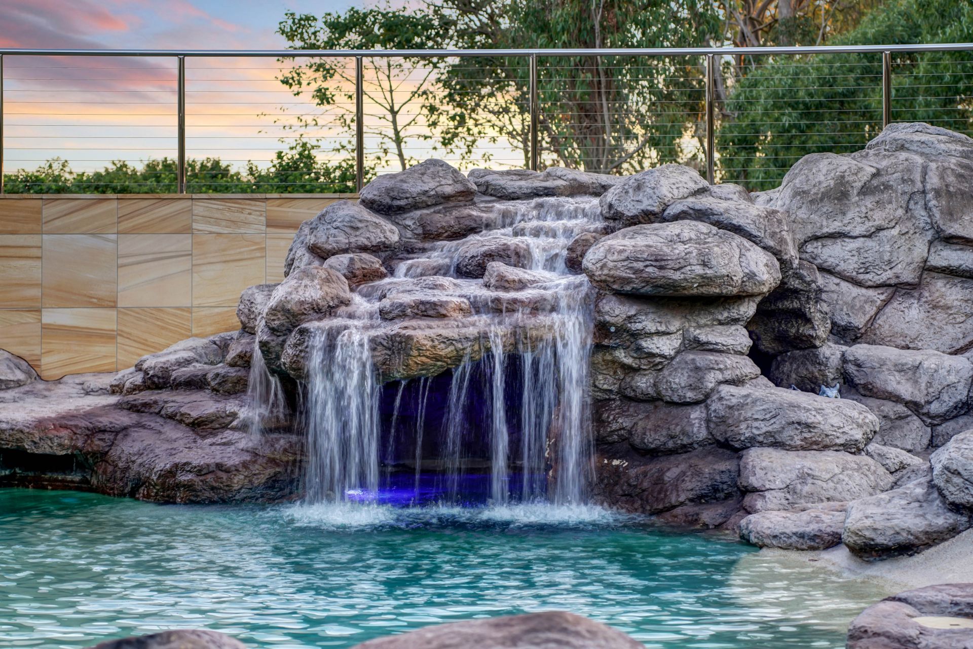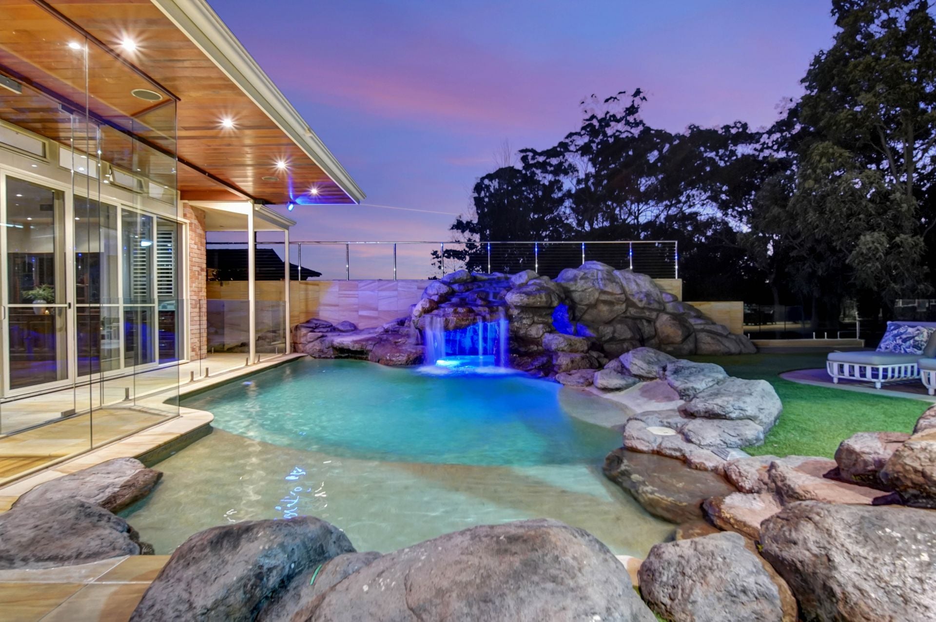 • A sublime inground pool with beach entry, spa, impressive waterfall feature, and grotto.