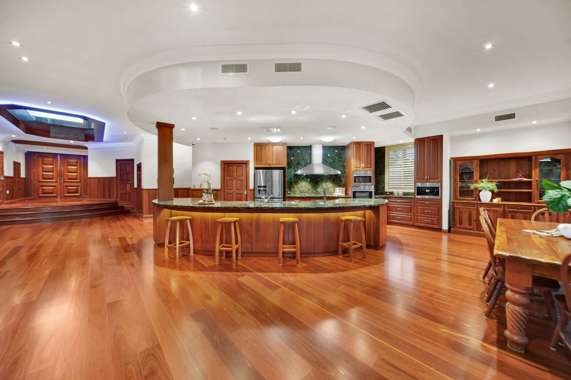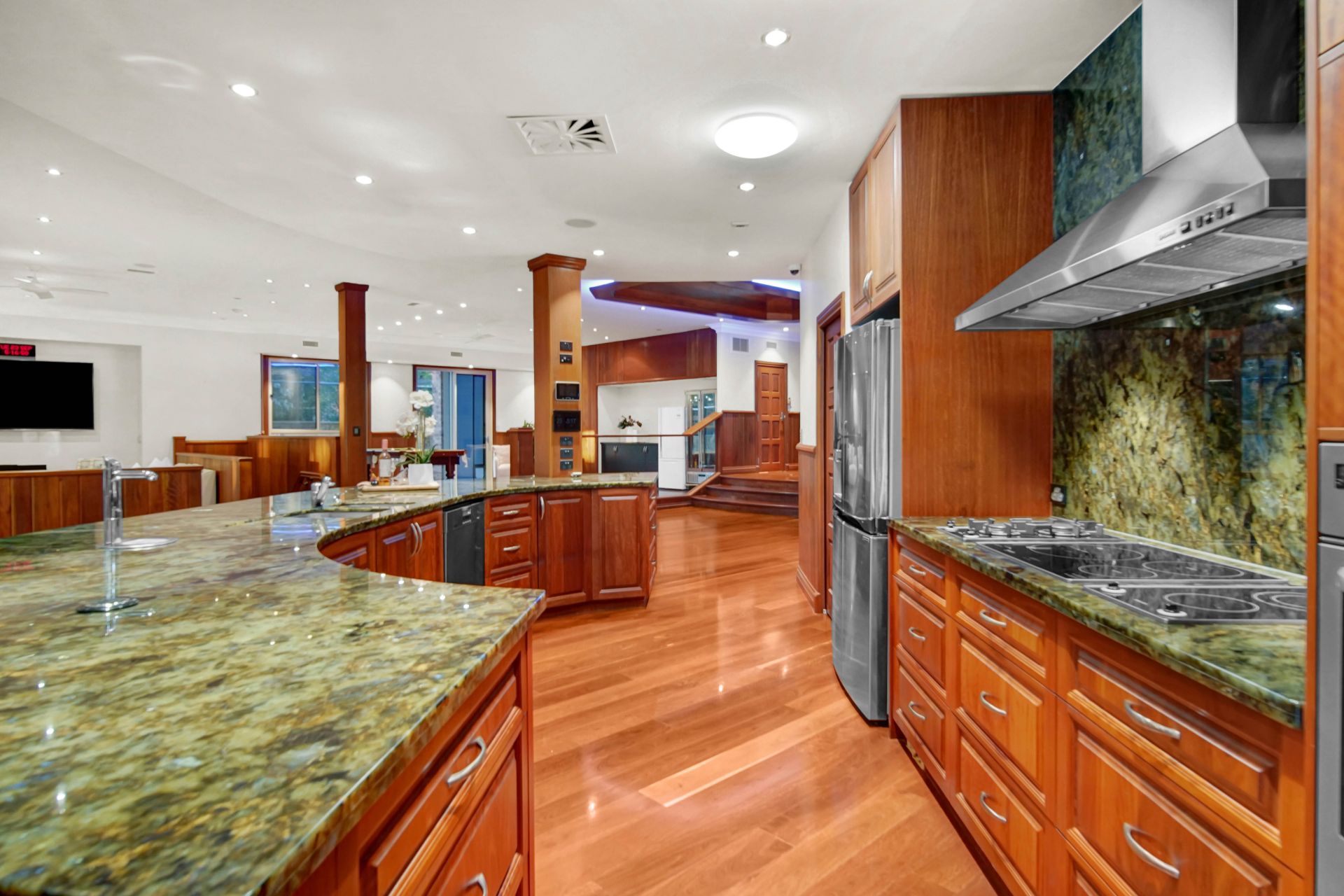 • At the heart of the home is a glamorous designer kitchen with Labradorite stone benchtops (a form of granite that has crystal infusions). The solid timber kitchen is superbly appointed with a full range of Miele appliances including an induction and a gas cooktop, double ovens, a dishwasher, and a coffee station. Additional bonuses include a walk-in pantry, built-in Zip hot/cold water tap and an insinkerator.