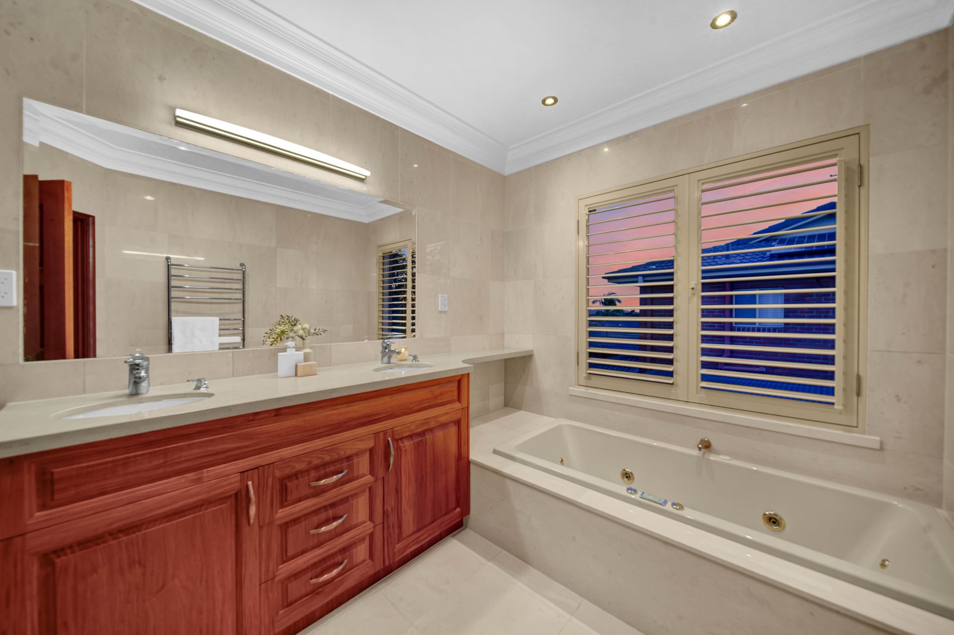 • The opulent master bedroom is privately positioned at the rear of the home with bushland views. Relax and unwind in the grand open spa bath. A huge ensuite with floor to ceiling tiles and a double sink vanity helps cut down on bathroom time for busy couples. A fabulous walk-in robe with an abundance of built-in cabinetry and hanging space completes your master suite.