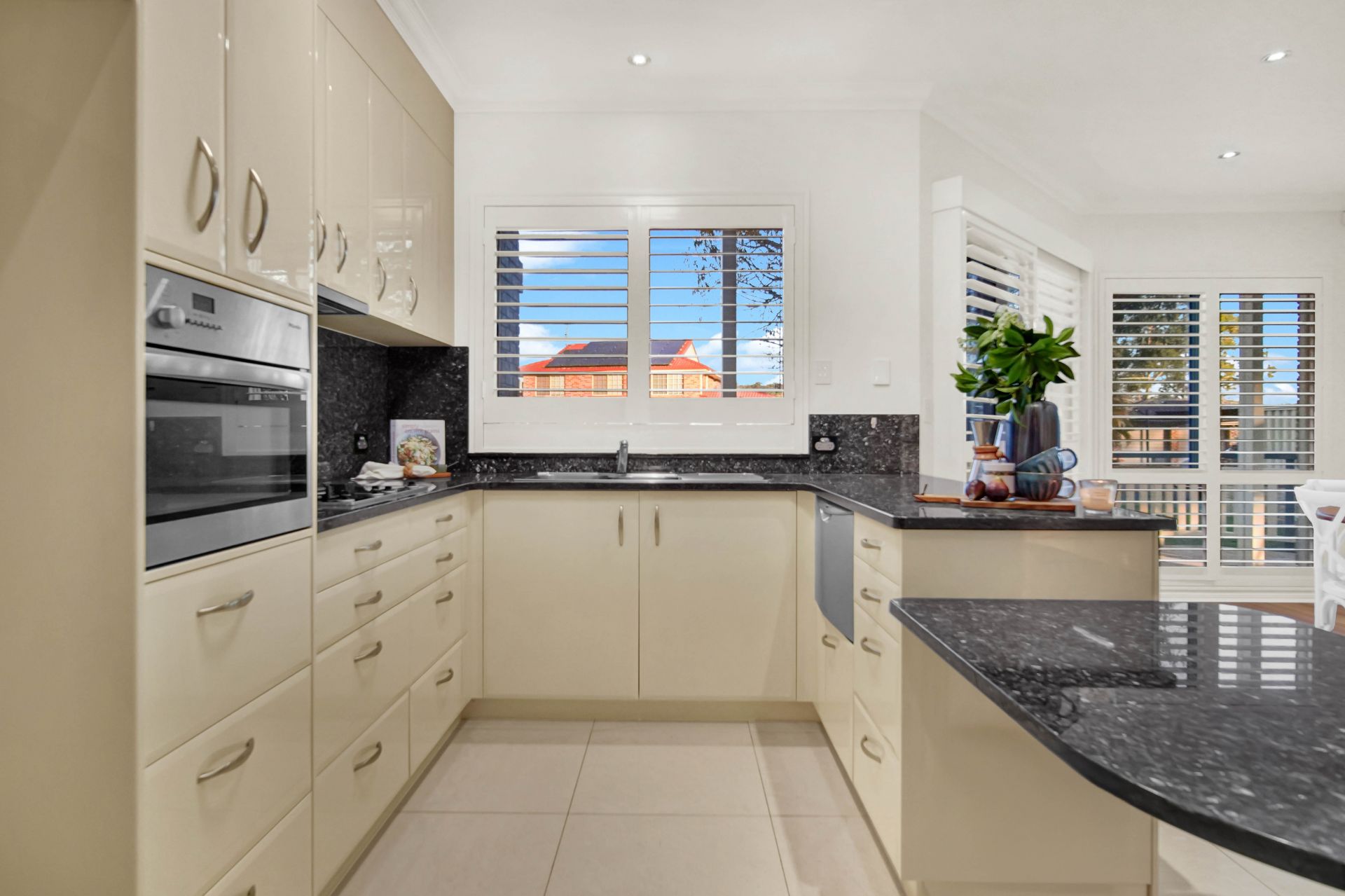 • Full kitchen with white 2pac cabinetry, and classy granite benchtops and splashbacks. A Miele oven and Miele gas/electric cooktop combined.