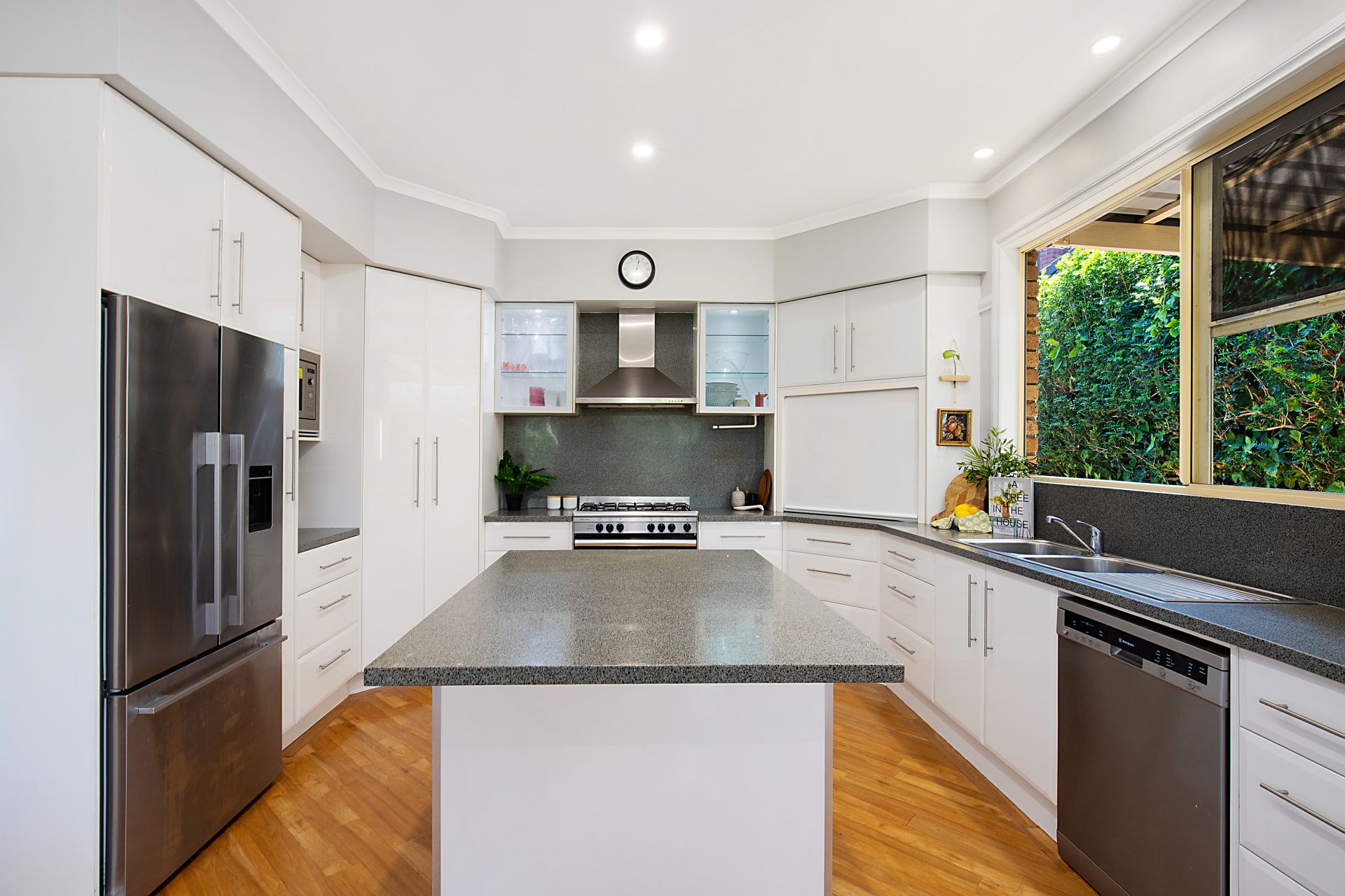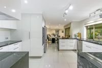 • The designer kitchen features stone benchtops and glossy white cabinets. There is an abundance of cupboard, pantry, and bench space, including an appliance cupboard/coffee station zone and an island bench complete with built-in storage cupboards. Superbly appointed, the kitchen features a full range of appliances including a 900mm Italian Glem gas oven and 5-burner gas cooktop, an Ilve built-in microwave and a stainless-steel Westinghouse dishwasher.